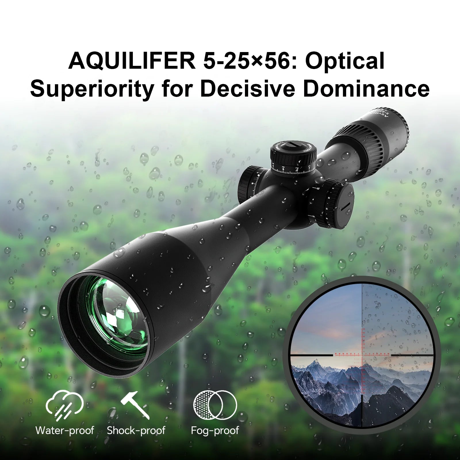 The Aquilifer EP 5-25x56 is a high‑performance First Focal Plane (FFP) riflescope engineered for long‑range precision, tactical shooting, and demanding field conditions. Its versatile 5–25x magnification and large 56mm objective lens deliver exceptional clarity, brightness, and target identification at extended distances.